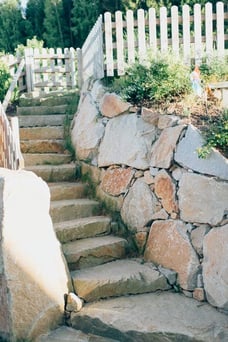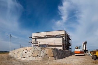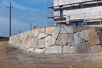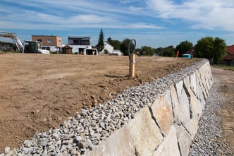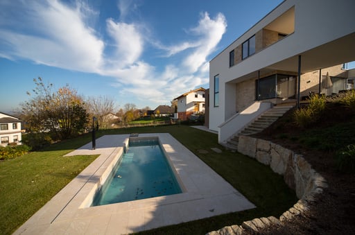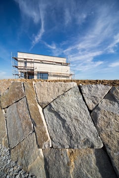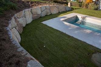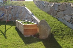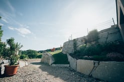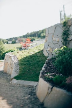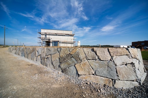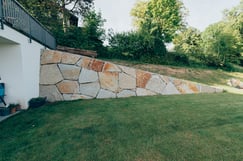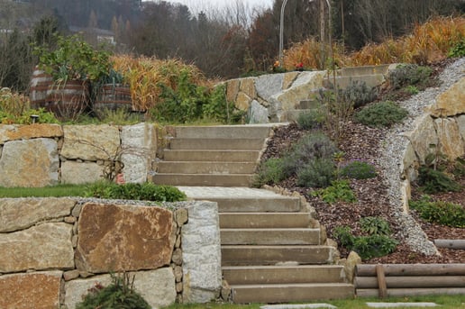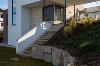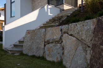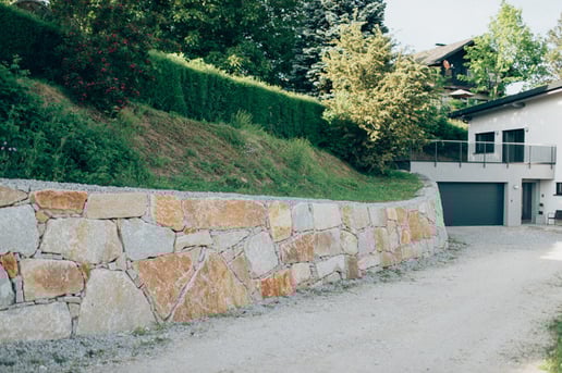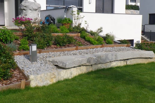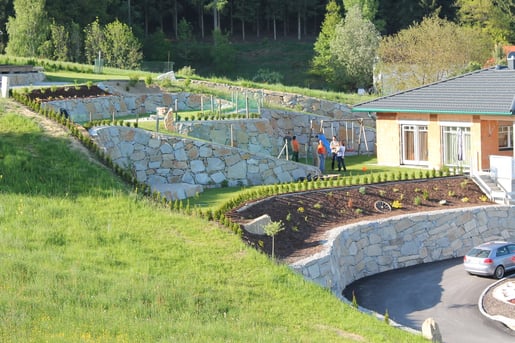 Bei der Durchführung des Landschaftsrohbaus wurden mit Hilfe von Steinmauern einzigartige Plätze geschaffen. Dadurch umgeben den zeitgemäßen Neubau jede Menge Plätze zum "Kraft tanken" für die ganze Familie.