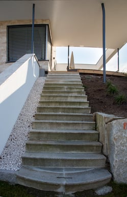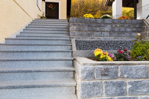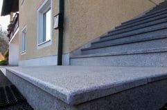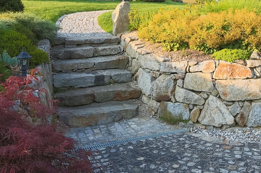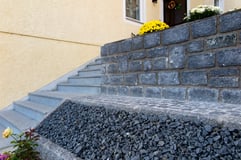 Die Gestaltung mit Natursteinen in verschiedenen Variationen lässt diesen Außenbereich in neuem Glanz erstrahlen. Der solide Untergrund erleichtert der Familie den täglichen Alltag und ermöglicht es "Kraft zu tanken".