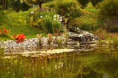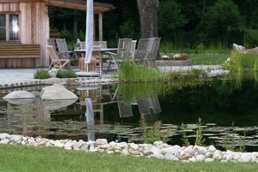 Bereits seit 10 Jahren kann Fam. Brandstetter "Kraft tanken" in Ihrer tollen Außenanlage. Ein gemütlicher Sitzbereich mit Feuerstelle und einem Bachlauf der in den Schwimmteich mündet lädt zum Erholen und Verweilen ein.