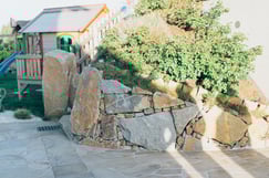 Bei dieser Außenanlage wurde der gesamte Landschaftsrohbau mit den verschiedenen Höhen und Steinmauerelementen angelegt. Viele schöne Plätze sind zum Erholen entstanden und können zum "Kraft tanken" genützt werden.