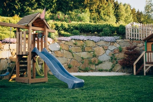 Die terrassenförmige Außenanlage rund ums "Generationenhaus" kann durch die vielen liebevoll gestalteten Plätzchen von der ganzen Familie zum "Kraft tanken" genutzt werden.